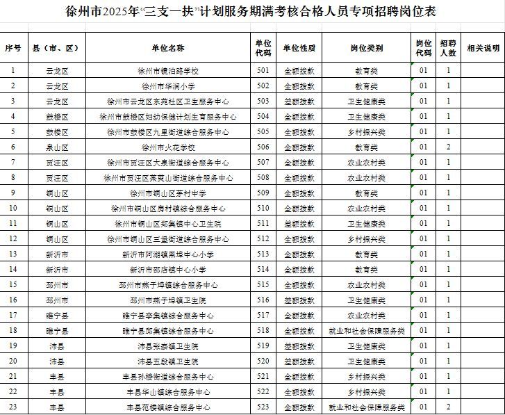 徐州市2025年三支一扶计划服务期满考核合格人员专项招聘岗位表