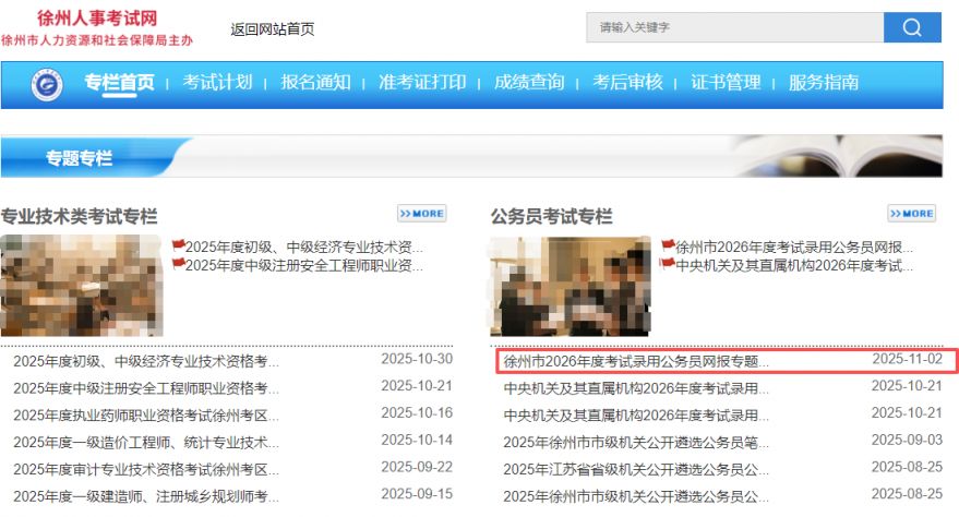 1、进入“徐州人事考试网”(http://hrss.xz.gov.cn/rsks )官网,点击进入“徐州2026年度考试录用公务员网报专题。